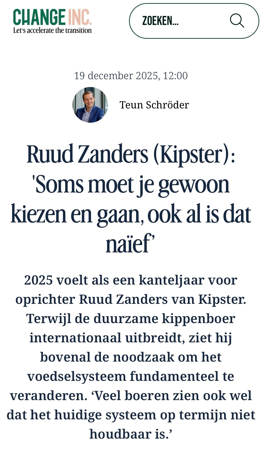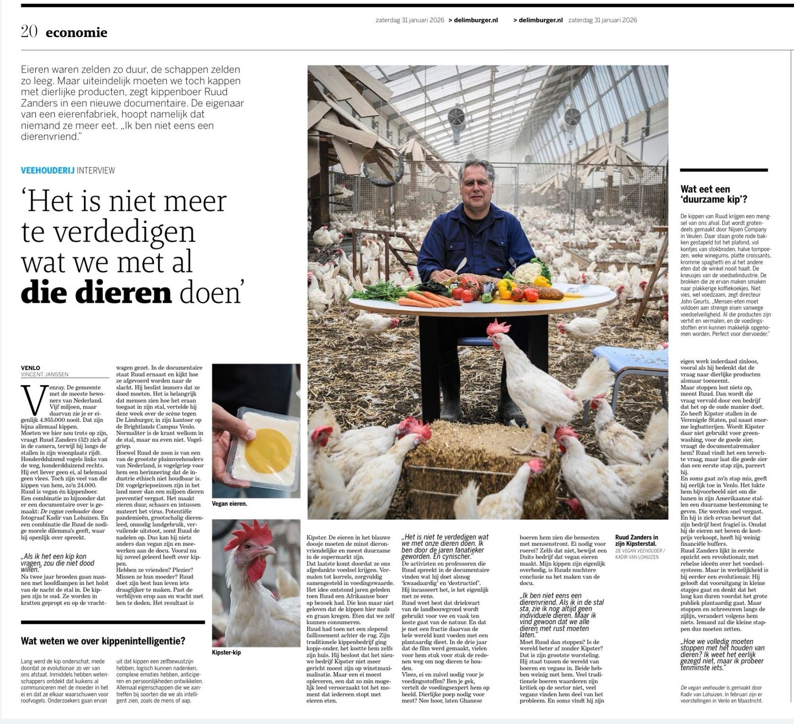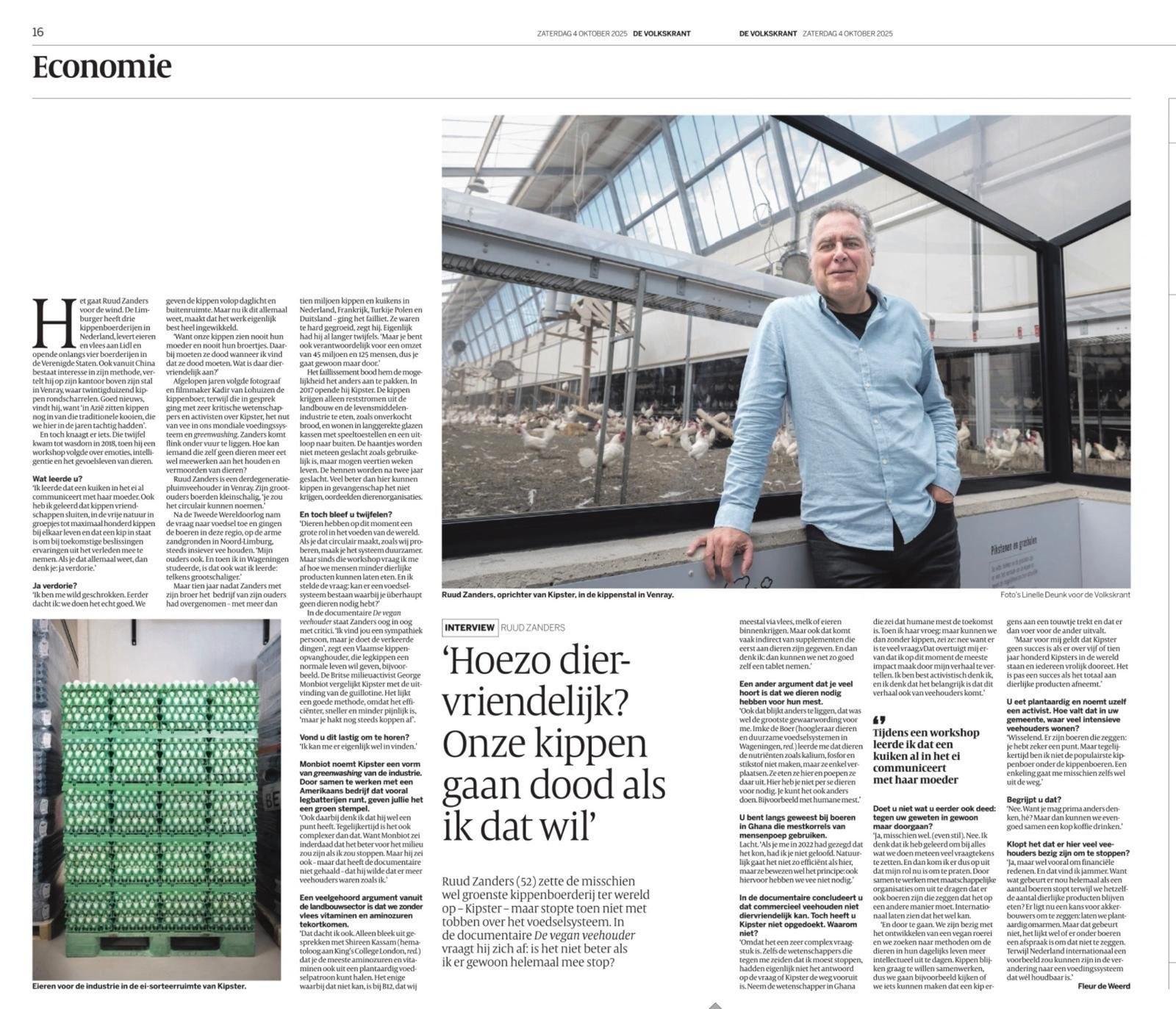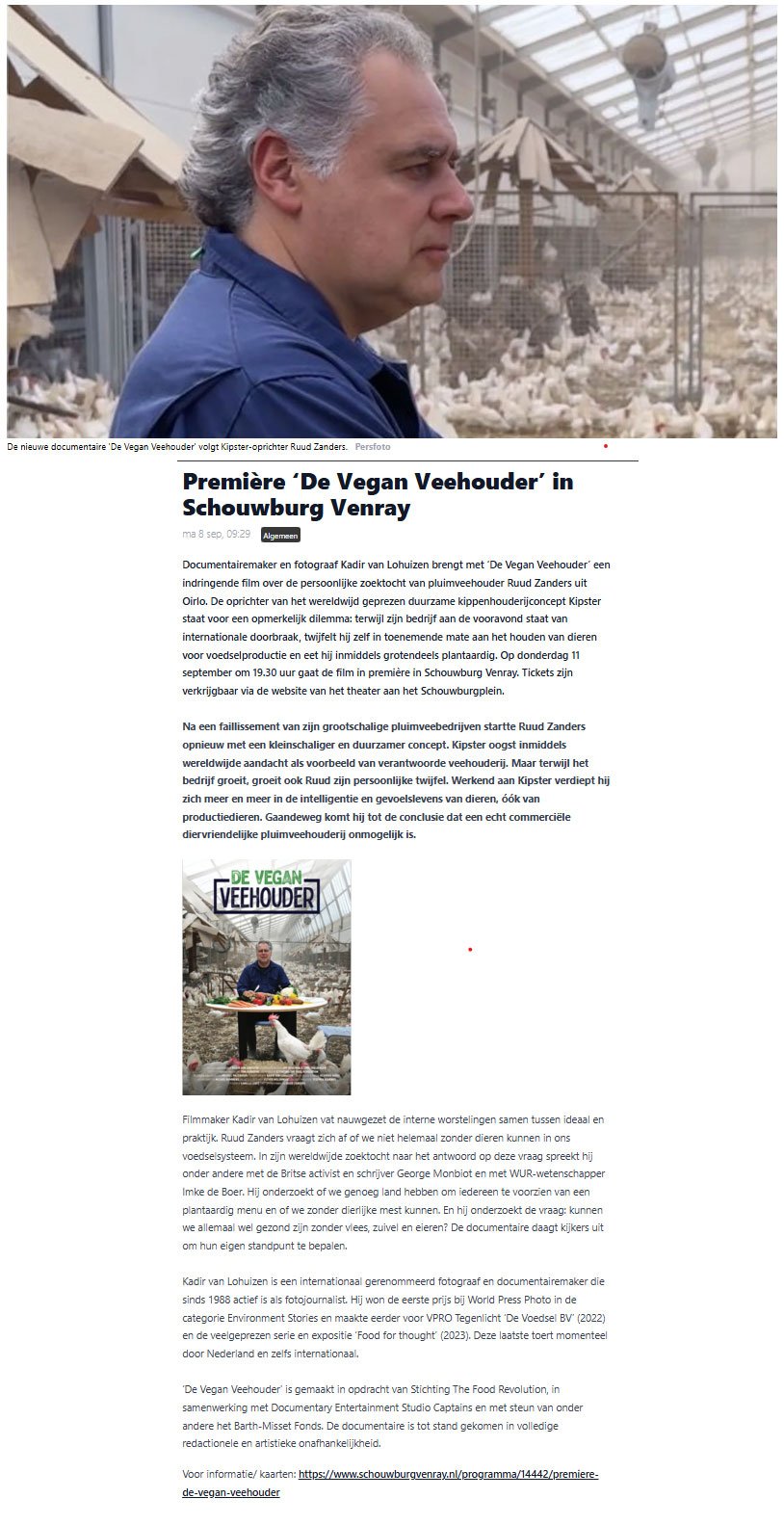 DE VEGAN VEEHOUDER: "Het is niet meer te verdedigen wat we met al die dieren doen" Lees het hele interview DE VEGAN VEEHOUDER: Hoe gaat het met de boerderijen van Kipster? Klik hier voor de podcast De Vegan Veehouder "Soms moet je gewoon kiezen en gaan, ook al is dat naïef" Klik hier voor het interview De Vegan Veehouder”. Kun je de veehouderij beëindigen door 'm te verbeteren? Klik hier voor de podcast FLCaféXXL: De Vegan Veehouder-Mag een vegan boer nog kippenhouden Klik hier voor de podcast ‘Onze kippen moeten dood wanneer ik vind dat ze dood moeten. Wat is daar diervriendelijk aan?’ Lees het hele artikel Première ‘De Vegan Veehouder’ in Schouwburg Venray Lees het hele artikel Documentaire over vegan veehouder in Venray Lees het hele artikel